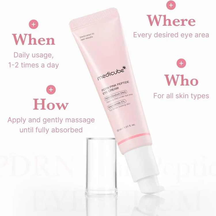 Medicube PDRN Pink Peptide Eye Cream is a powerful Korean eye treatment designed to target dark circles, fine lines, and loss of elasticity around the eyes.